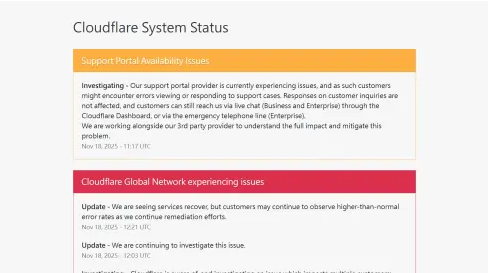 旧金山科技企业Cloudflare于世界协调时间(UTC)11月18日11点48分表示:「Cloudflare 已知并正在调查一个影响多位客户的问题,广泛存在500 errors,Cloudflare 仪表板和 API 也都失效」, 公司已经问题正努力了解其全面影响并减轻状况。 而台湾时区则是UTC+8小时,因此大约在今(18)日晚间7点开始,民众能明显感受大到大量网站无法查看。